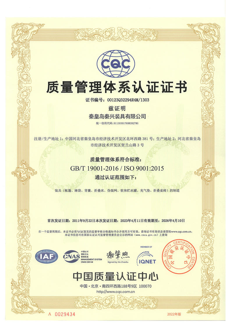 秦皇島秦興裝具有限公司有限公司源于我國第3524工廠,創建于2005年,占地面積30畝,是一家致力于研究,發展,制造和銷售為一體的綜合性裝具及紡織服裝加工生產企業,我們的主要產品有單、棉帳篷,民用帳篷,旅游帳篷集各種機工產品等。